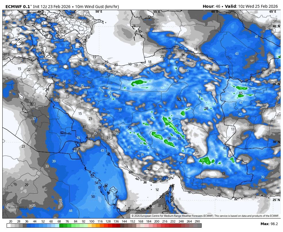 ضیائیان درباره وضعیت وزش باد در کشور بیان کرد: امروز (۶ اسفند) در نیمه شرقی، بخشهایی از مرکز، شمالغرب و استانهای واقع در دامنههای جنوبی البرز، روز جمعه (۸ اسفند) در شمالغرب و نوار شرقی و روز شنبه (۹ اسفند) در شمالغرب و غرب کشور، در بعضی ساعات وزش باد شدید رخ خواهد داد.